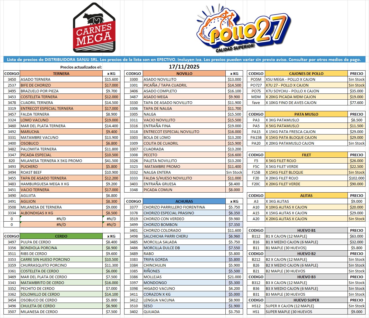 Carnes Mega · Pollo 27 · Distribuidora Sanju SRL